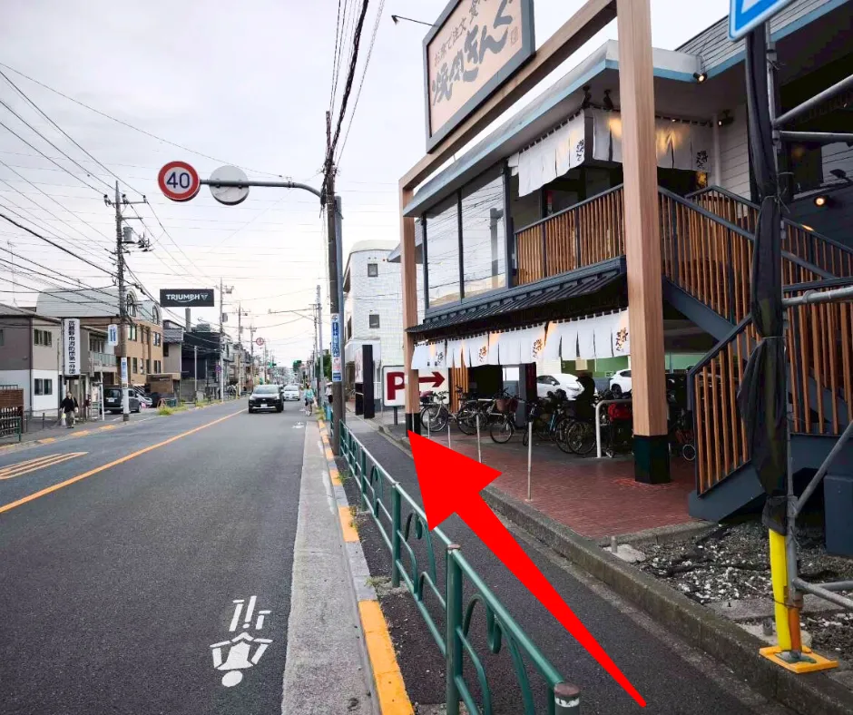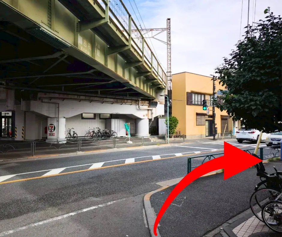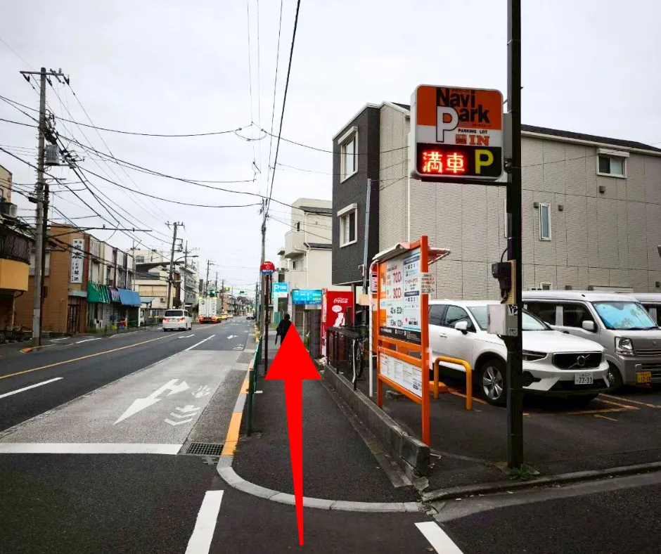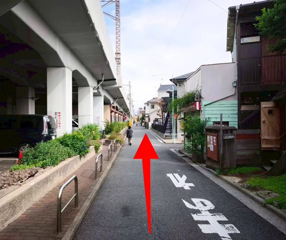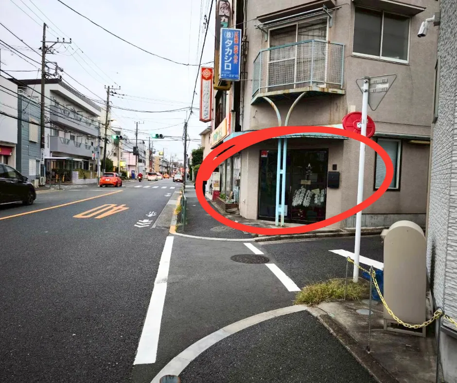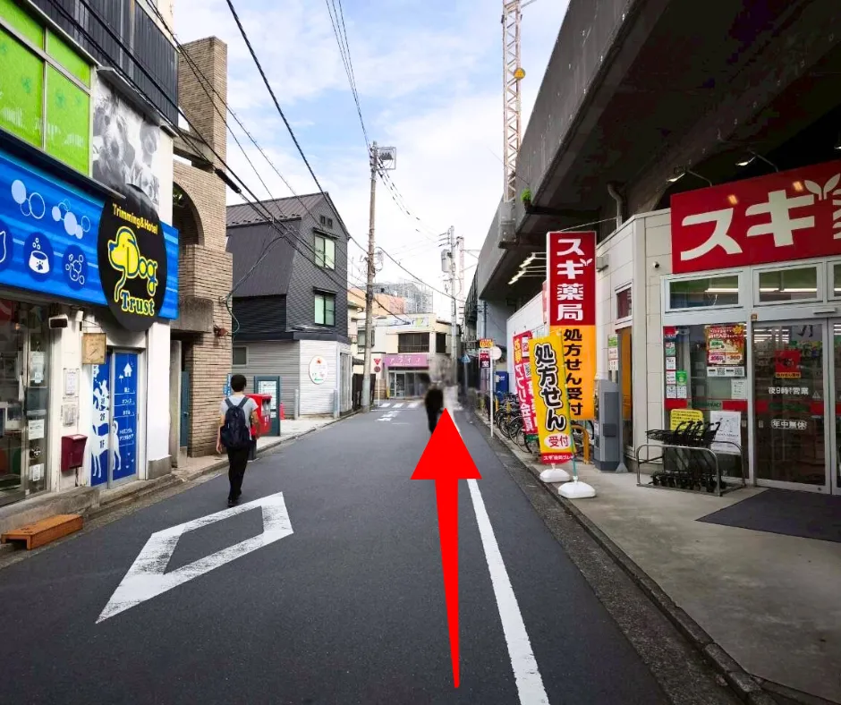 スギ薬局さんが見えたら横断歩道を通り右へ曲がり、一つ目の角を左に曲がります。